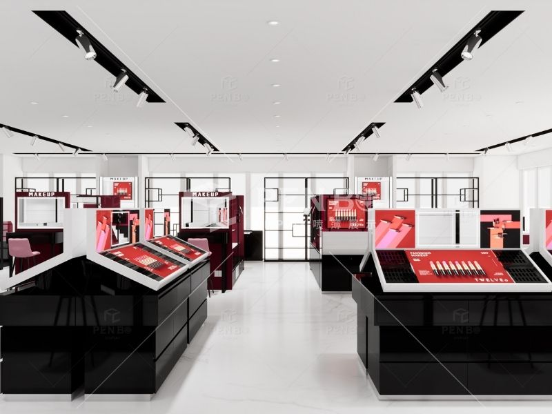 Modern makeup store interior design with wall display cabinets and tester counters